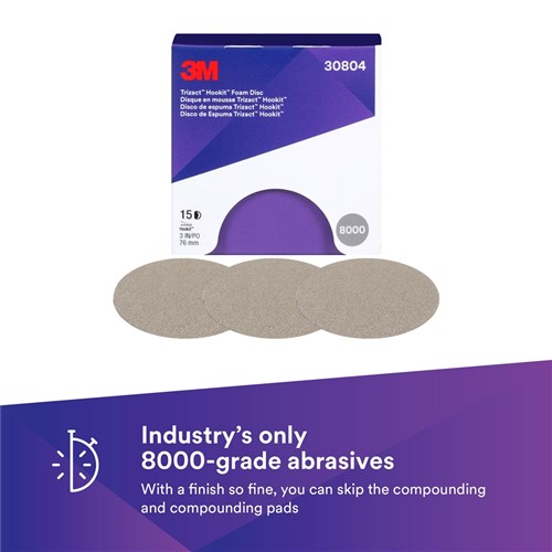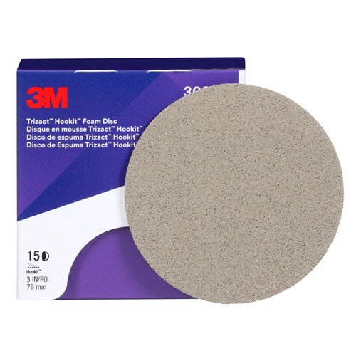 Our 3M Trizact Hookit Foam Abrasive Disc removes fine sand scratches on painted surfaces to reduce the amount of time spent compounding. Three-dimensional mineral abrasive structures are distributed uniformly across the disc surface and wear evenly for consistent finishes, longer disc life and reduced material costs. Foam backed discs are part of the 3M Perfect-It Paint Finishing System.